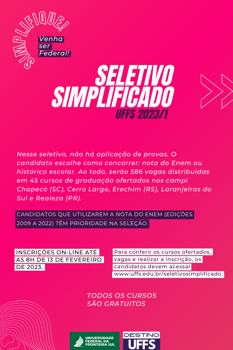 Para você que quer fazer uma graduação, seu destino é a Universidade Federal da Fronteira Sul. Estão abertas as inscrições para o Processo Seletivo Simplificado (PSS) que tem o objetivo de preencher as vagas remanescentes nos cursos de graduação dos campi de Chapecó (SC), Laranjeiras do Sul (PR), Realeza (PR), Cerro Largo (RS) e Erechim (RS).