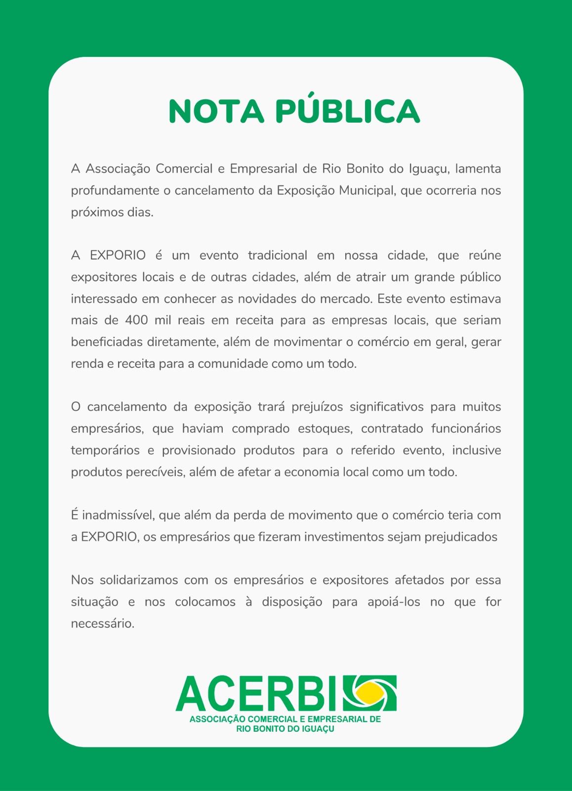 “A Associação Comercial e Empresarial de Rio Bonito do Iguaçu, lamenta profundamente o cancelamento da Exposição Municipal, que ocorreria nos próximos dias.