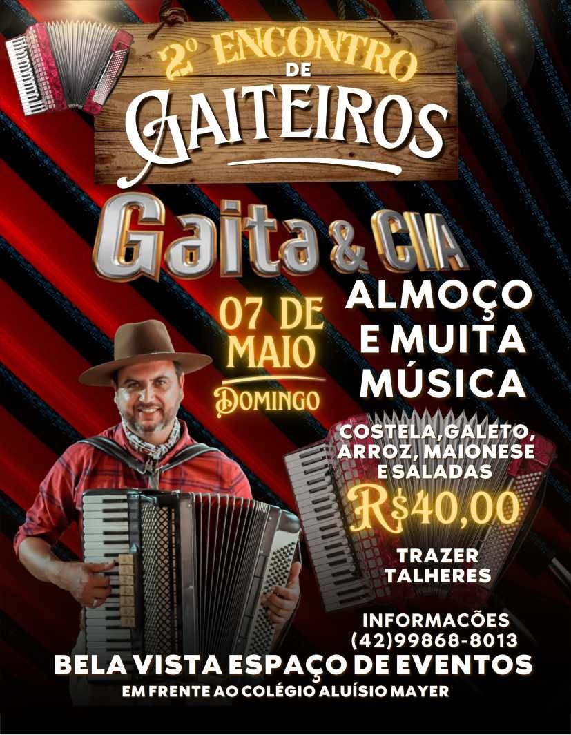 Acontece neste domingo, 07 de maio, em Laranjeiras do Sul, no Espaço Bela Vista, que fica localizado em frente ao Colégio AluÃsio Maier a 2ª edição do Encontro de Gaiteiros. O evento vai reunir os talentos musicais de toda a nossa região, e terá inÃcio ás 10h00 com a apresentação do Programa Gaita & Cia ao vivo do local. 12h teremos almoço, a base de Costela assada, galeto assado, maionese, arroz e saladas. Os cartões estão sendo comercializados na Escola de Música Gaita & Cia, e comércio local, ao preço de R$ 40,00, e os participantes deverão trazer pratos e talheres. Na parte da tarde haverá um animado matinê. Informações e reservas de cartões pelo fone Watss (42) 9 9868 8013.