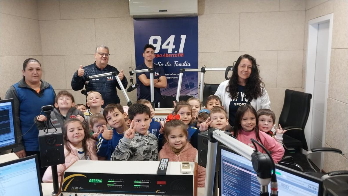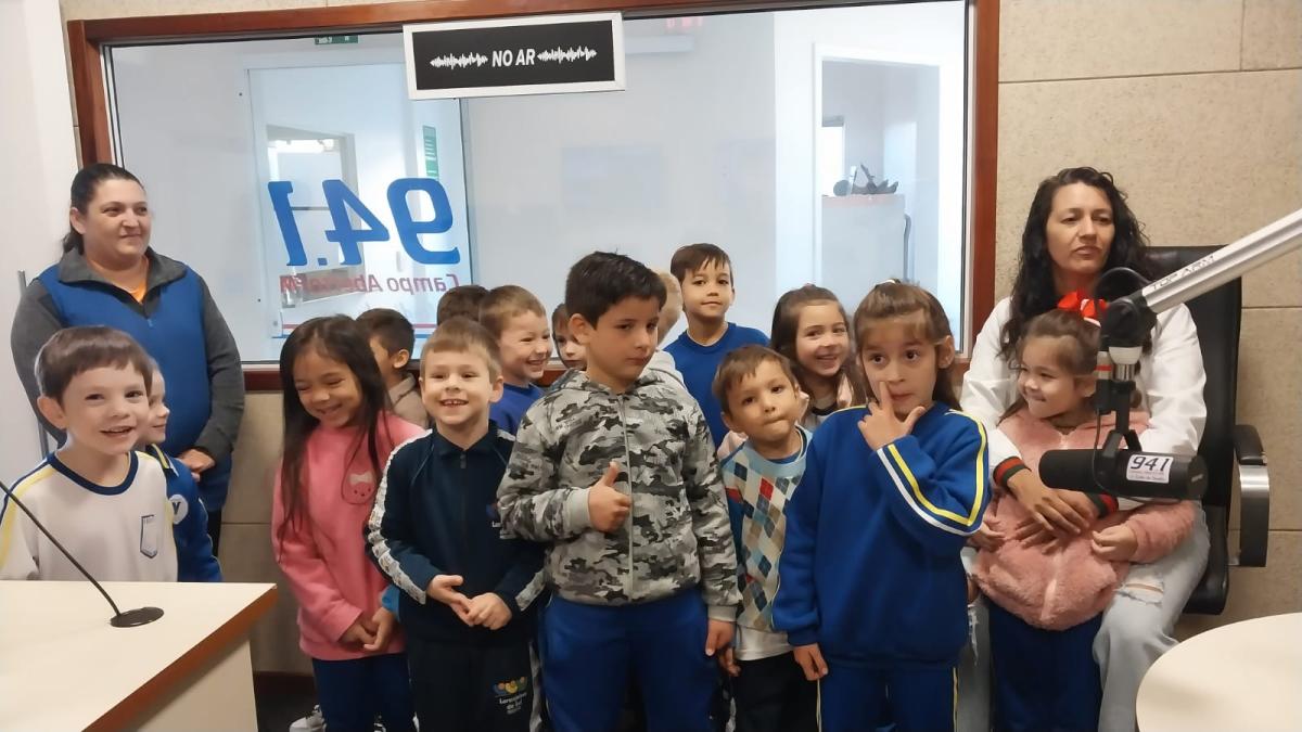 Na manhã desta sexta (12) os alunos da professora de educação infantil Eronice Ribeiro, da Escola Municipal AluÃsio Maier estiveram visitando a emissora, e participaram ao vivo do Programa Alegria Geral.