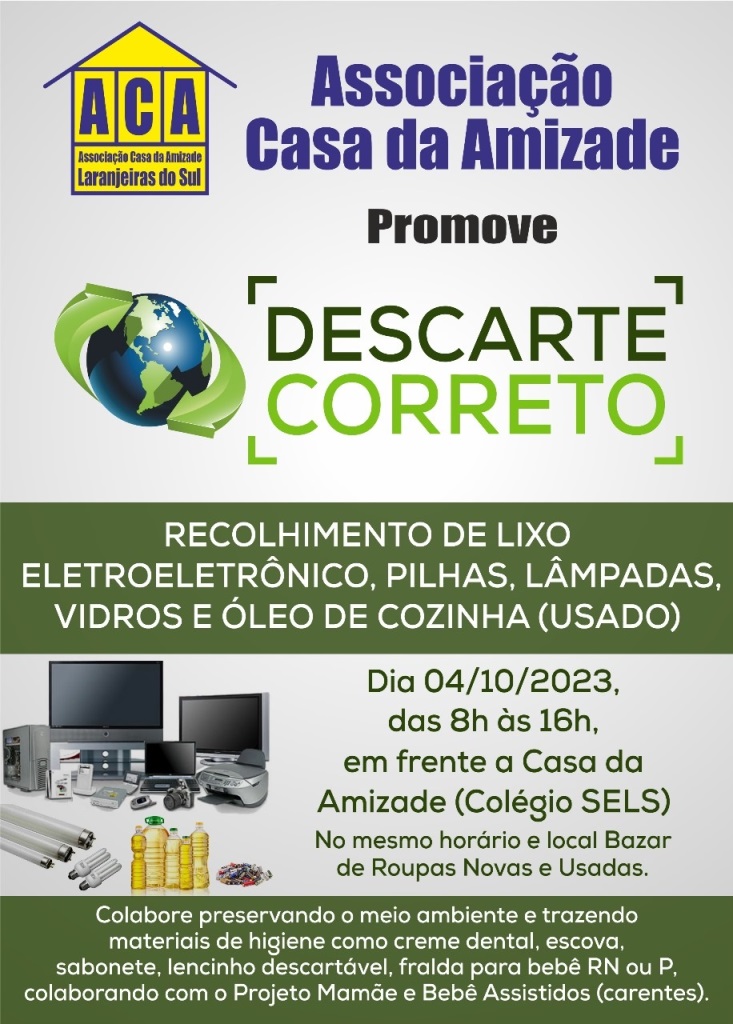 A ACA Associação Casa da Amizade de Laranjeiras do Sul, estará realizando no dia 04 de outubro, mais uma ação de recolhimento de lixo eletroeletrônico, o evento acontecerá no dia 04 de outubro, das 8h à s 16h, em frente à Casa da Amizade, e tem como objetivo coletar, todo tipo de lixo eletroeletrônico como: Pilhas, Lâmpadas, vidros e óleo de cozinha usado. Participe você também desse evento colaborando com a natureza e dando um destino correto ao lixo que tanto a prejudica, as Associadas da ACA, agradecem a sua colaboração.  Â