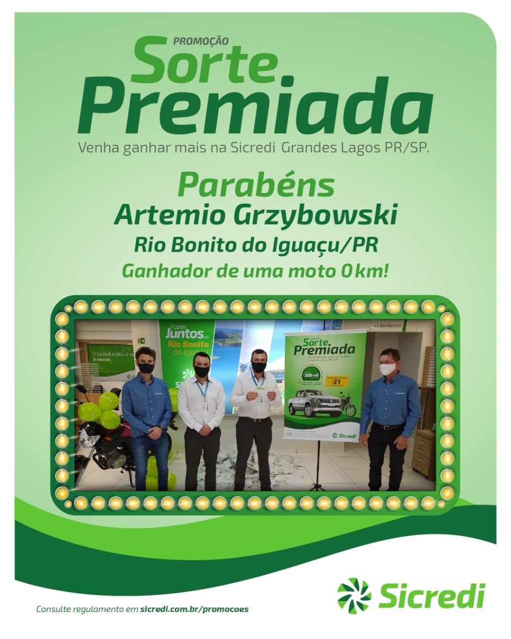 Iniciou nesta segunda-feira  (9),  a segunda semana de sorteios das motos da promoção Sorte Premiada, exclusiva para associados da Sicredi Grandes Lagos do Paraná e São Paulo. O sorteio  desta manhã (09/11) foi realizado na agência de Rio Bonito do Iguaçu, e o ganhador foi o associado Artemio Grzybowski do Assentamento Ireno Alves dos Santos.