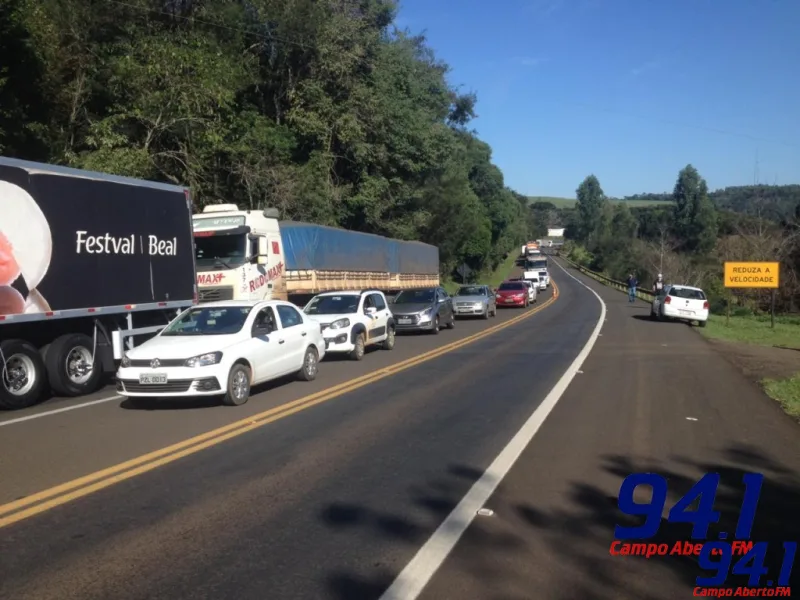 O acidente envolvendo uma carreta, um caminhão tanque e três veÃculos de passeio que aconteceu na manhã desta quarta-feira (17) na BR 277 entre Virmond e Cantagalo, interditou completamente a pista provocou um grande congestionamento, de aproximadamente 10 km. O acidente aconteceu por volta das 09h e a pista ficou interditada até por volta das 11h, quando foi liberada uma faixa, com o trânsito fluindo no sistema siga e pare. No acidente ninguém se feriu. A PRF e a Ecocataratas ainda estão atendendo o acidente.