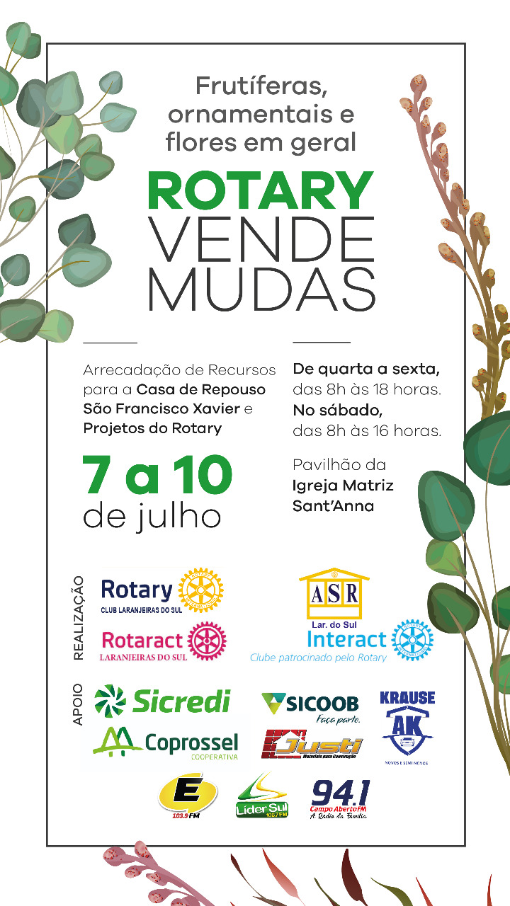 O evento será realizado de quarta-feira (07) a sábado (10) no Pavilhão da Igreja Matriz em Laranjeiras do Sul. Estará comercializando diversas espécies de mudas frutÃferas, ornamentais e flores em geral. A  arrecadação do recurso será destinada para a Casa de Repouso São Francisco Xavier e outros projetos do Rotary Clube de Laranjeiras do Sul.