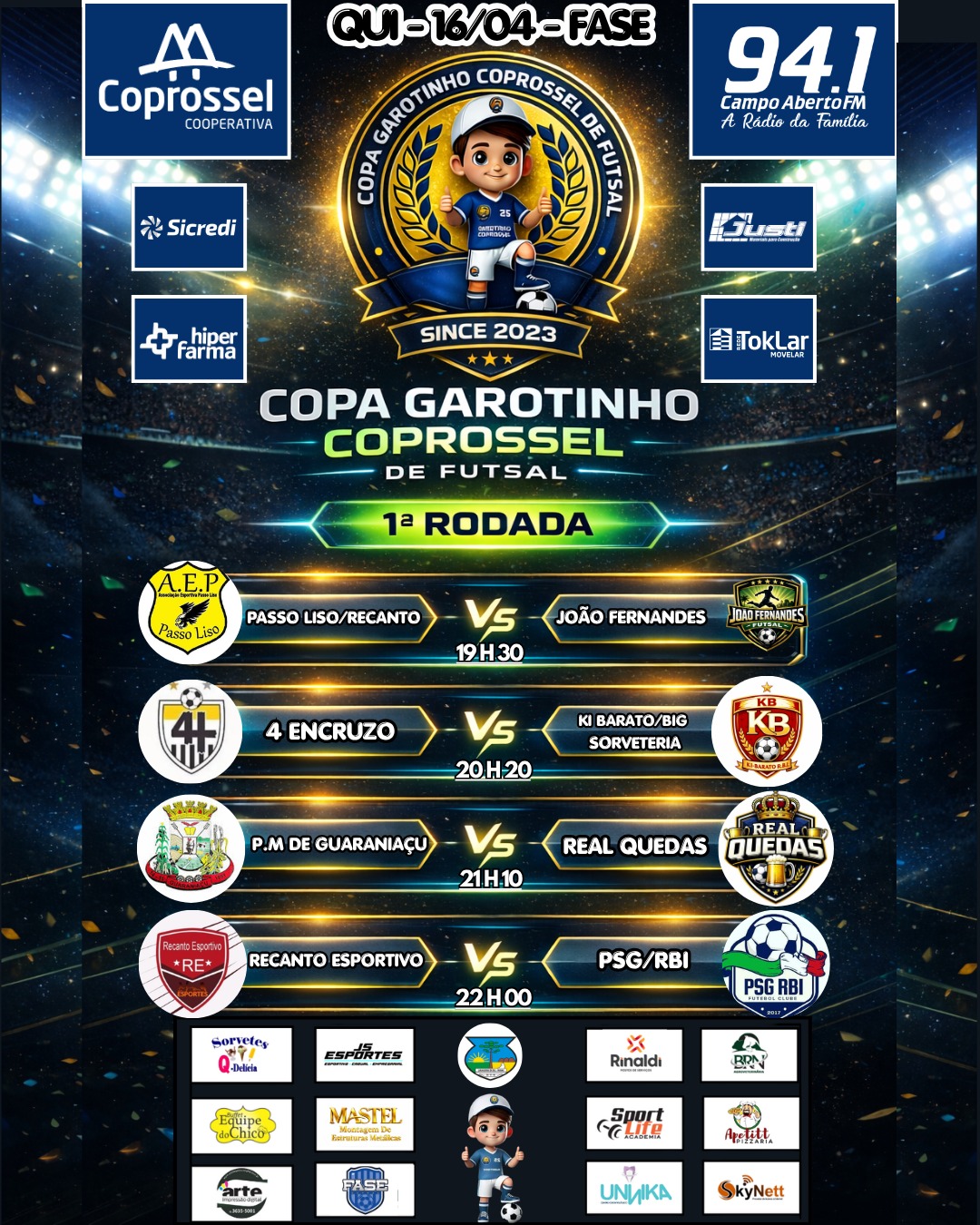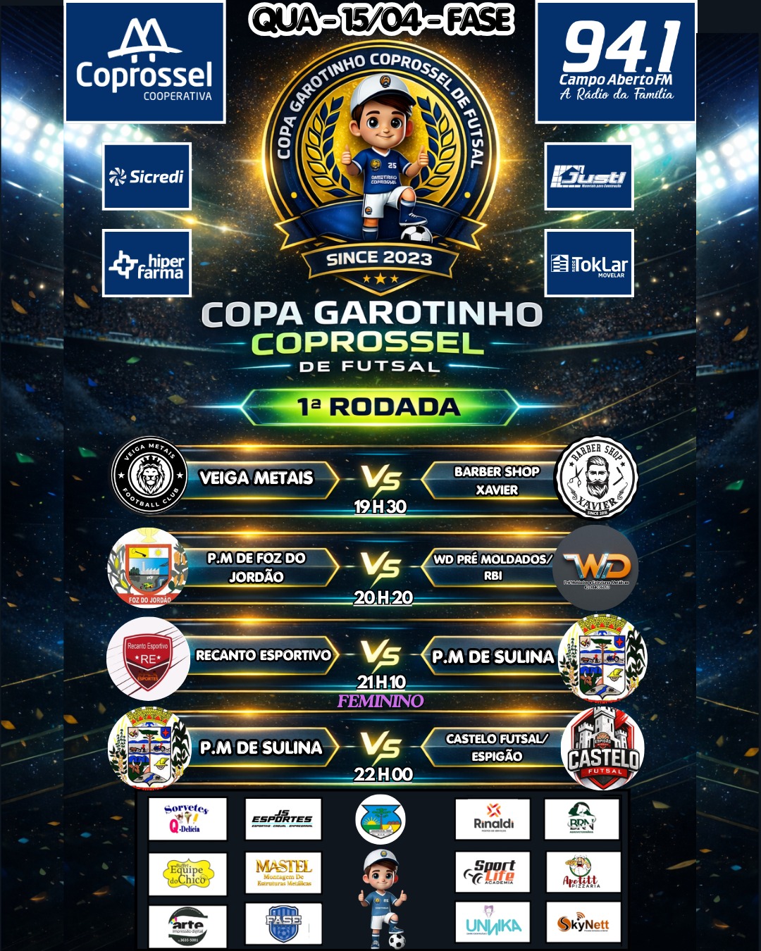 A 1ª rodada da Copa Garotinho Coprossel de Futsal 2026 – Masculino e Feminino Livre está definida. Os jogos começam nesta quarta-feira, 15 de abril e termina no dia 7 de maio. Os confrontos serão realizados (todos) na Arena da Fase em Laranjeiras do Sul.