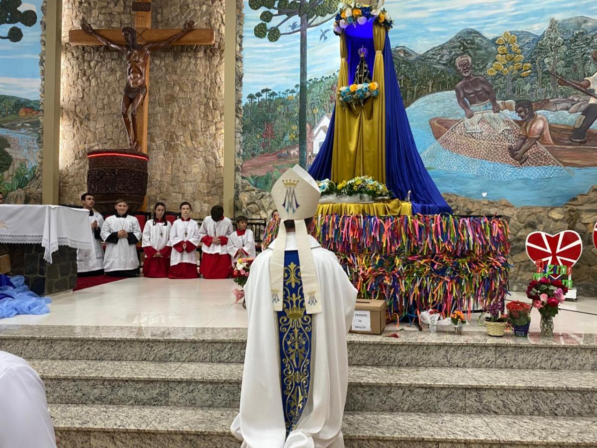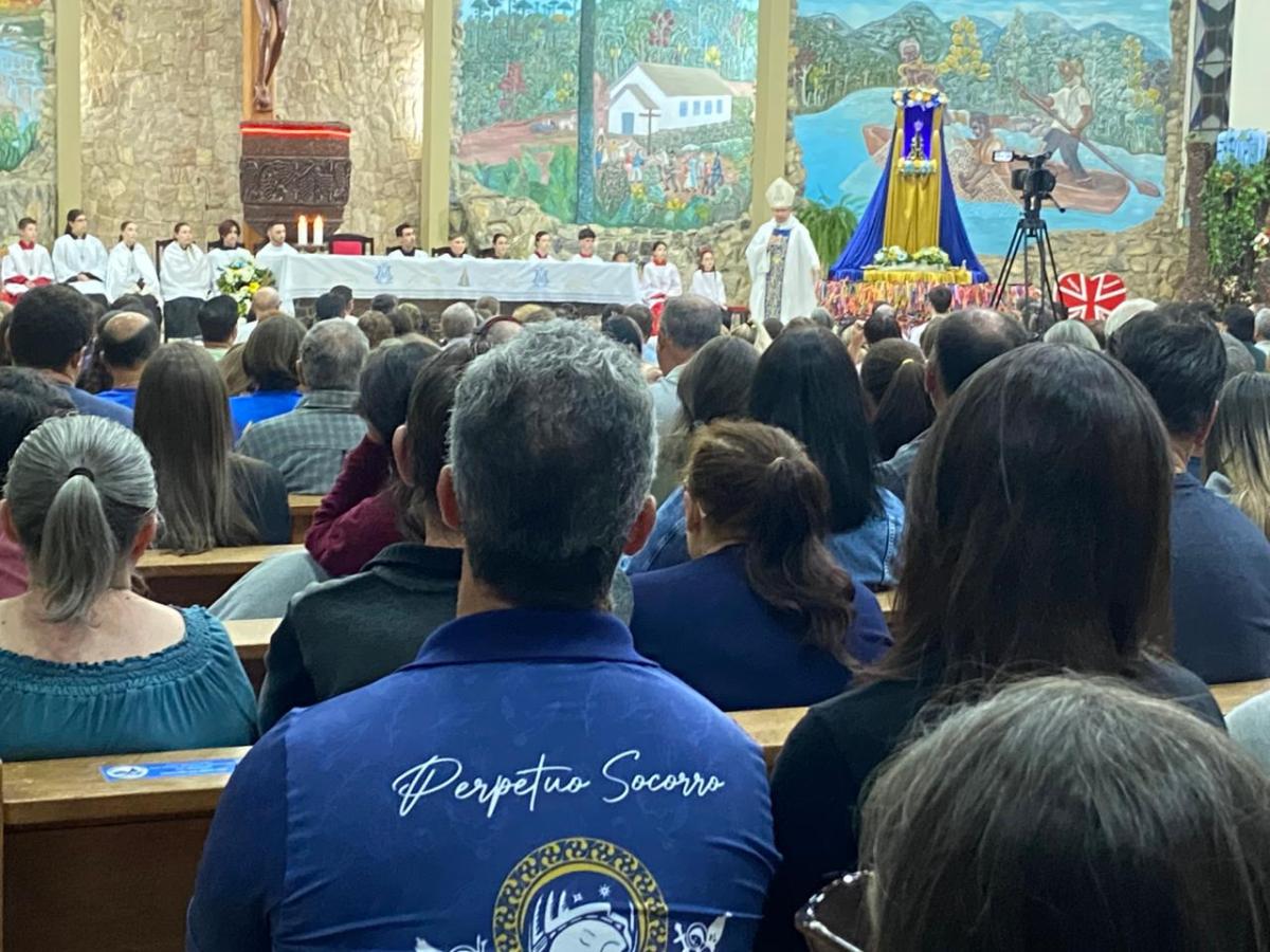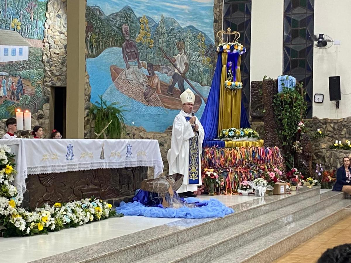 O Bispo Dom Amilton Manoel da Silva presidiu, na noite desta terça-feira (7), o 5º dia da Novena em honra a Nossa Senhora Aparecida, no Santuário de Laranjeiras do Sul. A celebração foi marcada por momentos de intensa fé, oração e emoção, reunindo centenas de devotos da Mãe Aparecida.