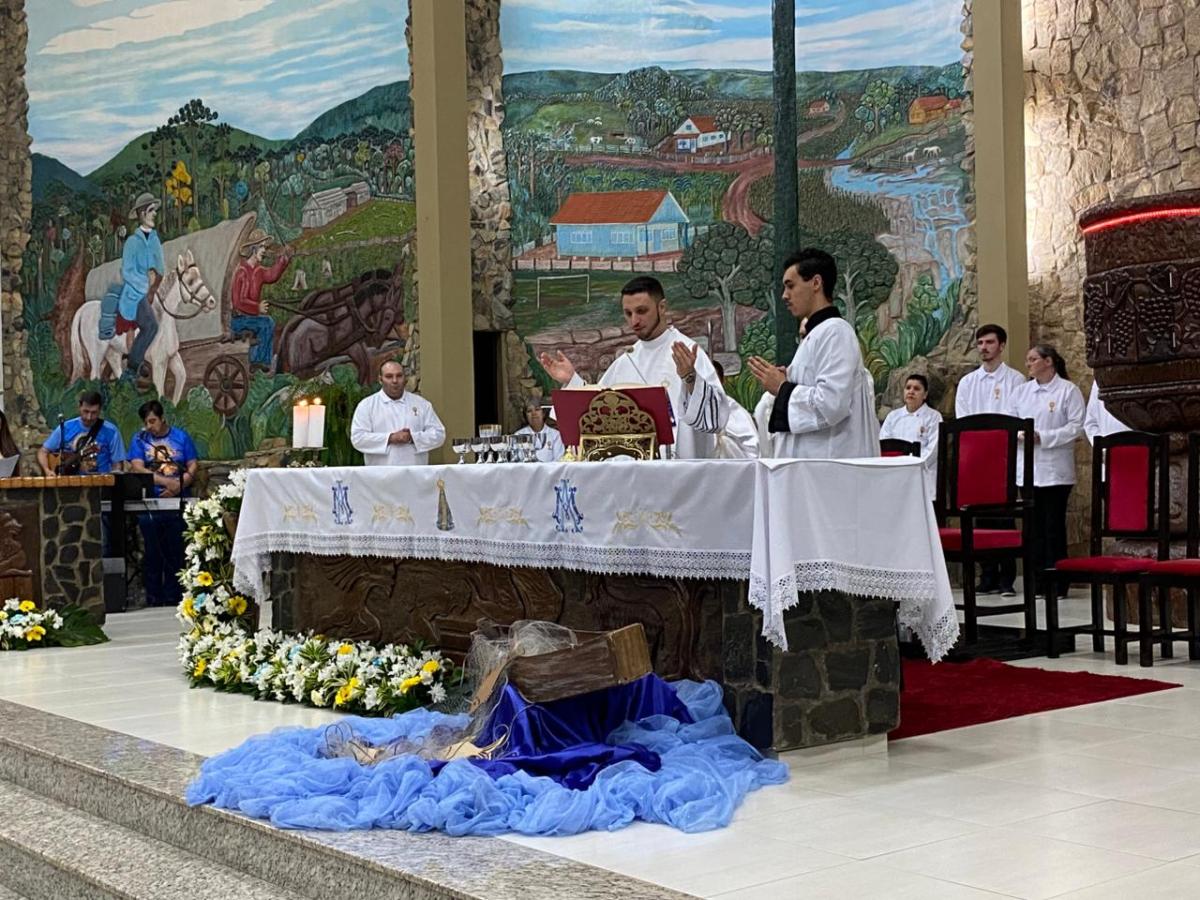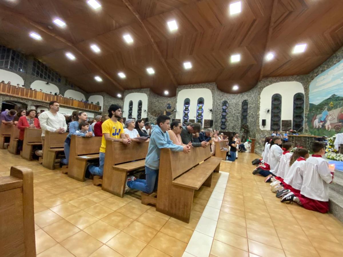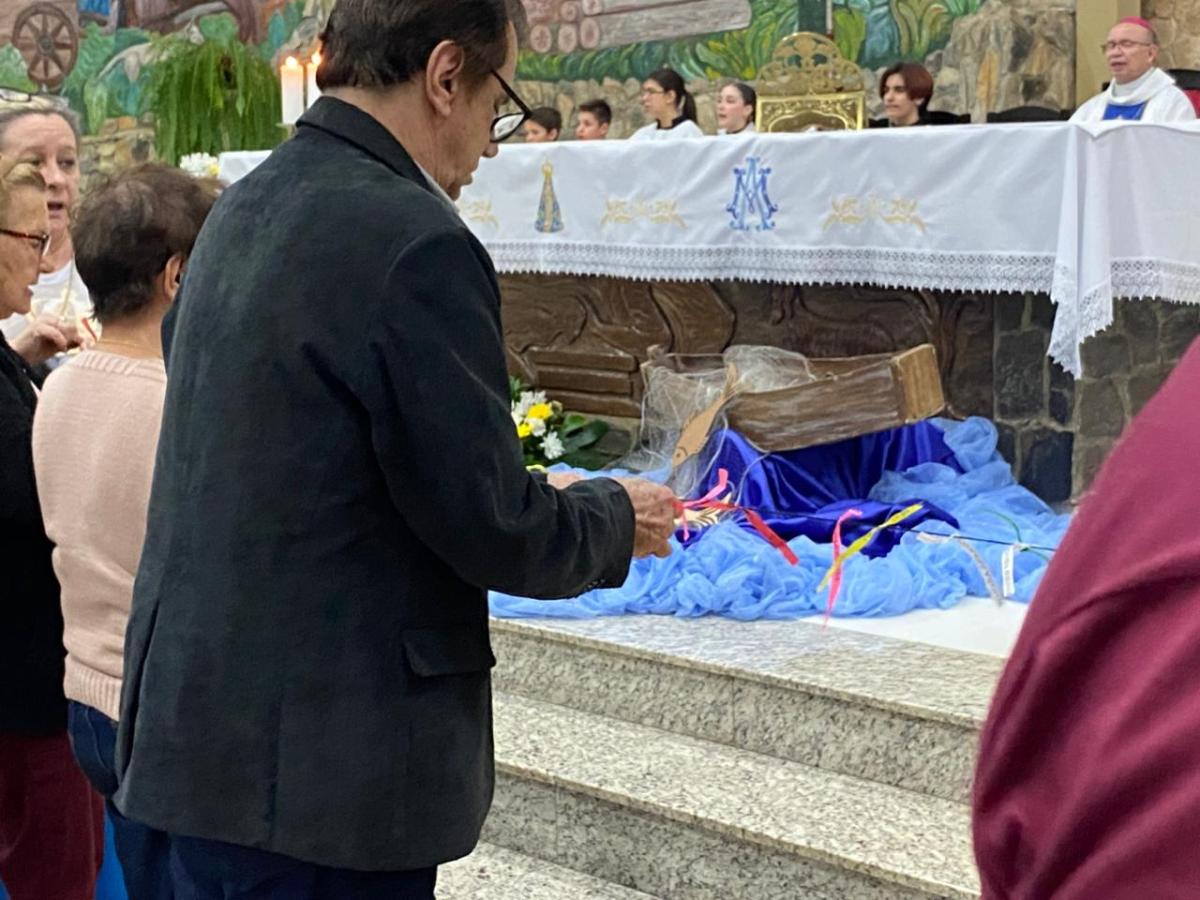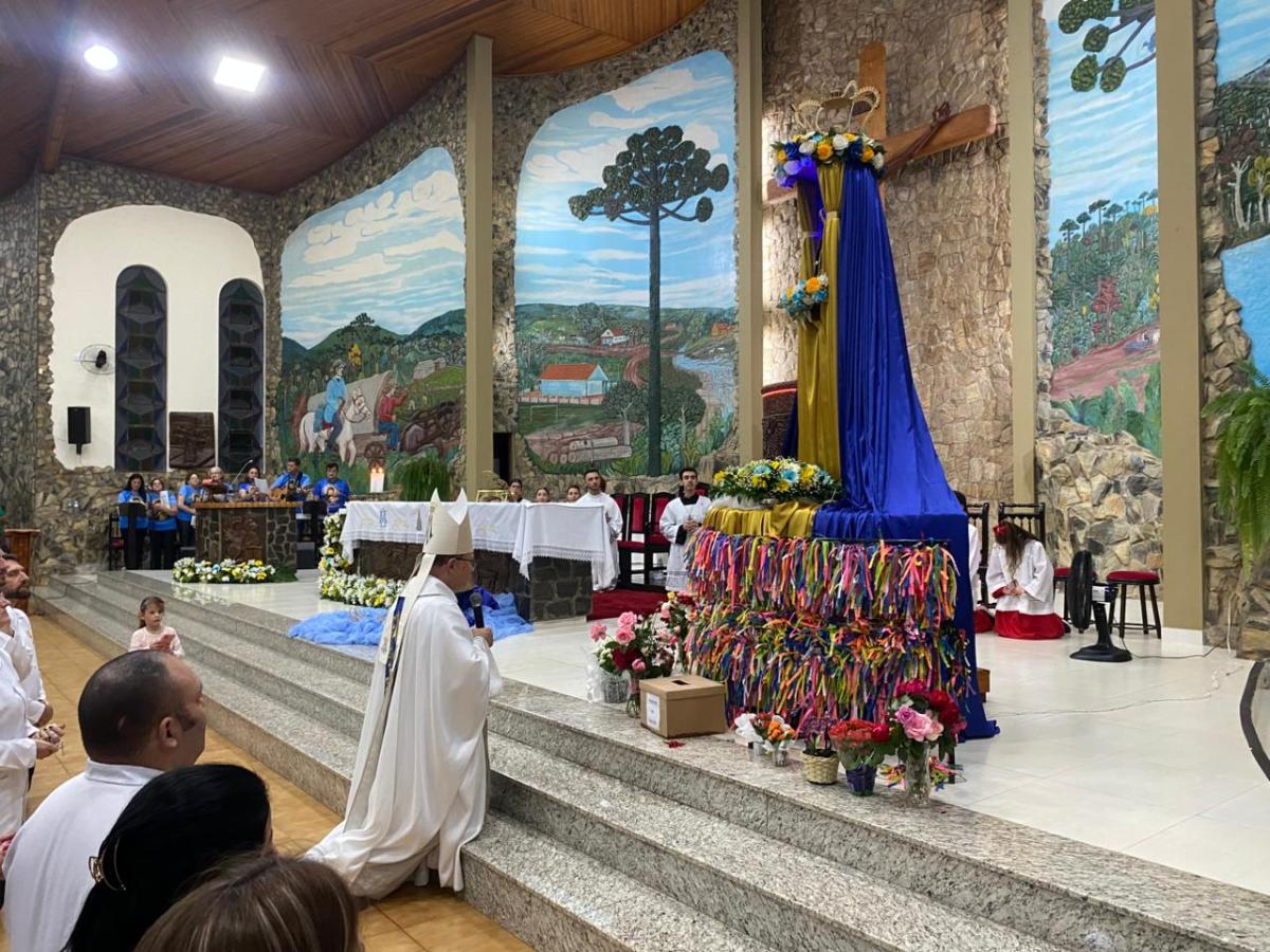 O Bispo Dom Amilton Manoel da Silva presidiu, na noite desta terça-feira (7), o 5º dia da Novena em honra a Nossa Senhora Aparecida, no Santuário de Laranjeiras do Sul. A celebração foi marcada por momentos de intensa fé, oração e emoção, reunindo centenas de devotos da Mãe Aparecida.