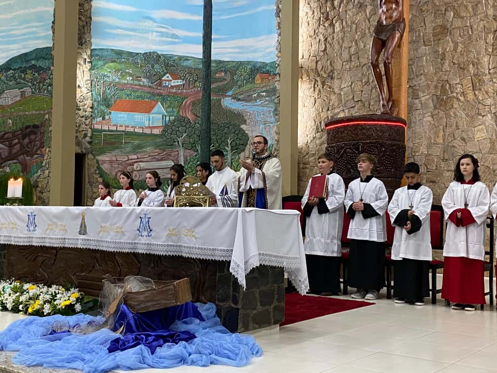 O Santuário Nossa Senhora Aparecida, em Laranjeiras do Sul, viveu na noite desta quarta-feira (8) mais um momento de fé e emoção com a realização do 7º dia da novena em honra à Mãe Aparecida. Centenas de devotos participaram da celebração, que contou com cânticos, orações e momentos de profunda espiritualidade.