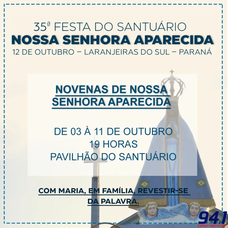 Em um formato diferente em função da Pandemia do Covid-19, iniciou no último sábado, Novena em Louvor a Nossa Senhora Aparecida no Pavilhão do Santuário, sempre à s 19 horas. 350 fiéis poderão participar das celebrações com todos os cuidados de enfrentamento a covid-19. Os devotos deverão levar flores para a hora do ofertório. Este ano o tema da Novena é Com Maria em FamÃlia, Revesti-se de Palavra.Â