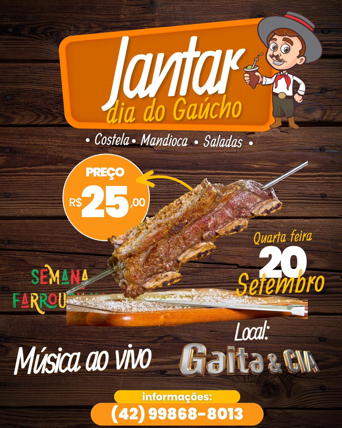 No dia 20 de setembro quarta-feira Dia do Gaúcho. Será realizado um jantar a base de costela assada, mandioca e saladas diversas, no Recinto do Gaita e CIA, localizado a rua XV de novembro em frente a antiga Telepar.