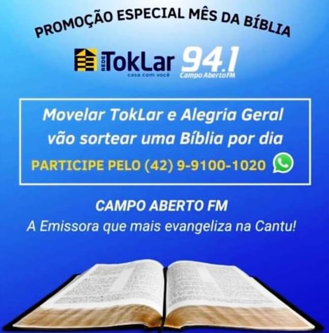 A Rádio Campo Aberto, através do Programa Alegria Geral, em parceria com a Movelar TokLar de Laranjeiras do Sul, realiza a promoção “Mês da BÃblia com Alegria Geralâ€. A promoção que vem sendo realizada há sete anos sorteia de segunda a sexta, durante todo o mês, uma BÃblia por dia.Â