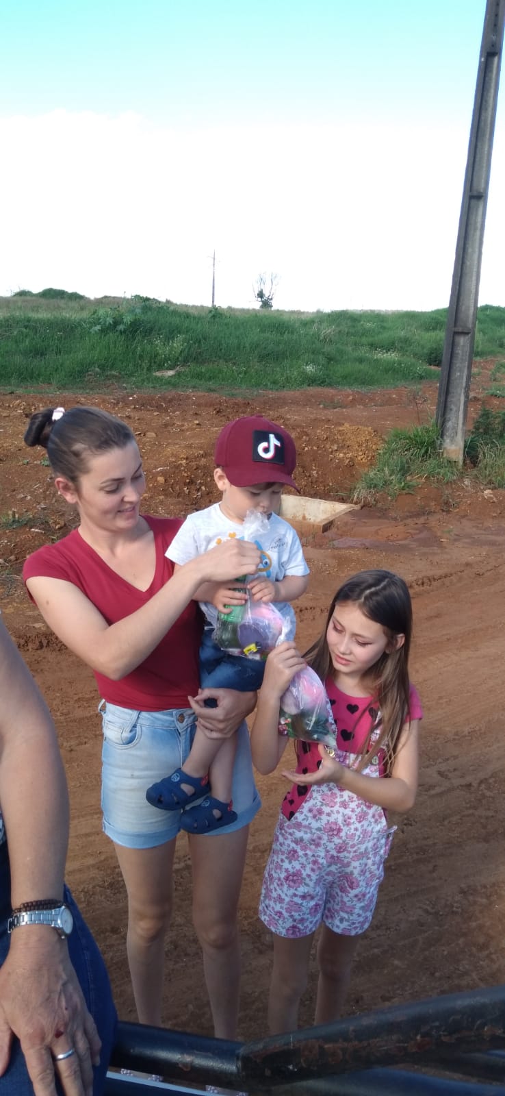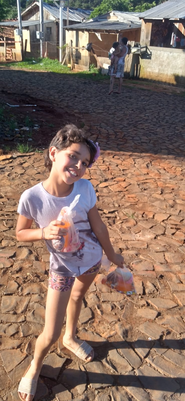 Neste ano, novamente ela teve o apoio de várias pessoas que doaram doces, ajudaram a montar os kits e a distribuir para as crianças.