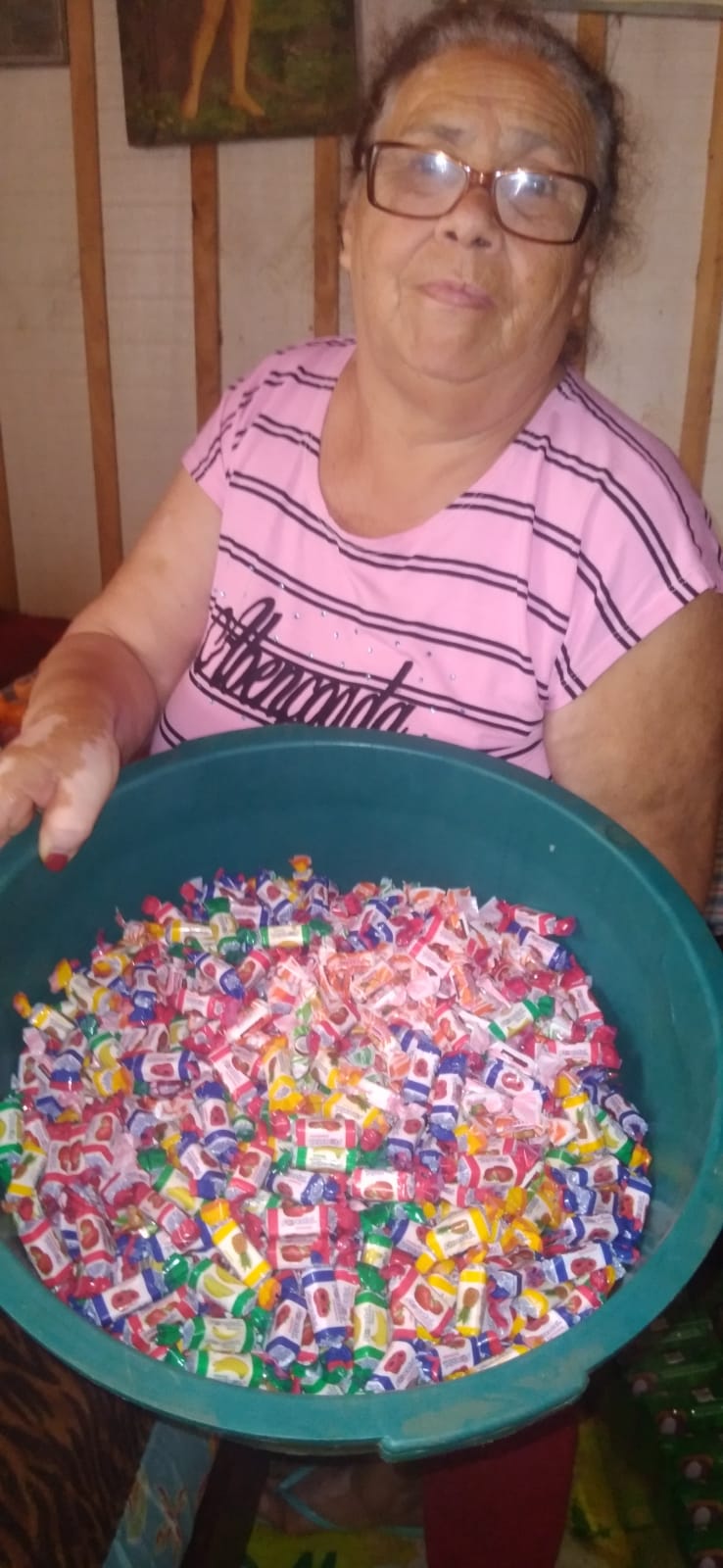 Quando chega o mês de outubro, ela arrecada doces para distribuir às crianças  mais carentes.