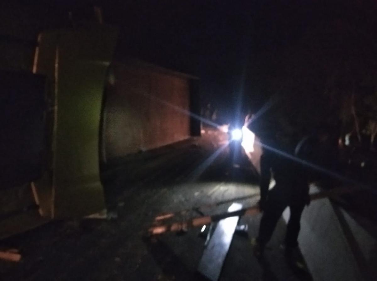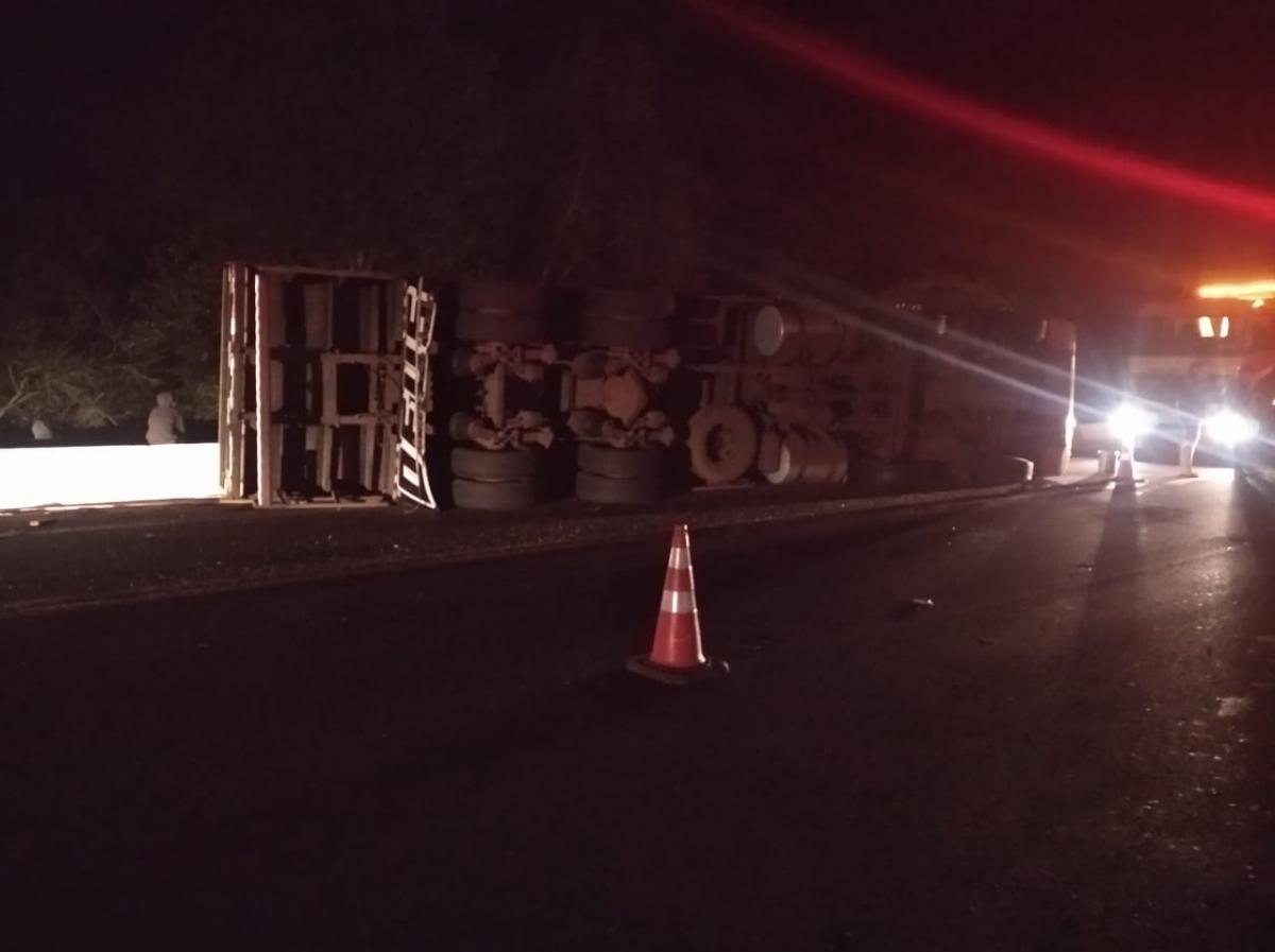 Em conversa com a PRF, o condutor alegou que foi desviar de um pedestre, sendo que a carreta se desgovernou e tombou.