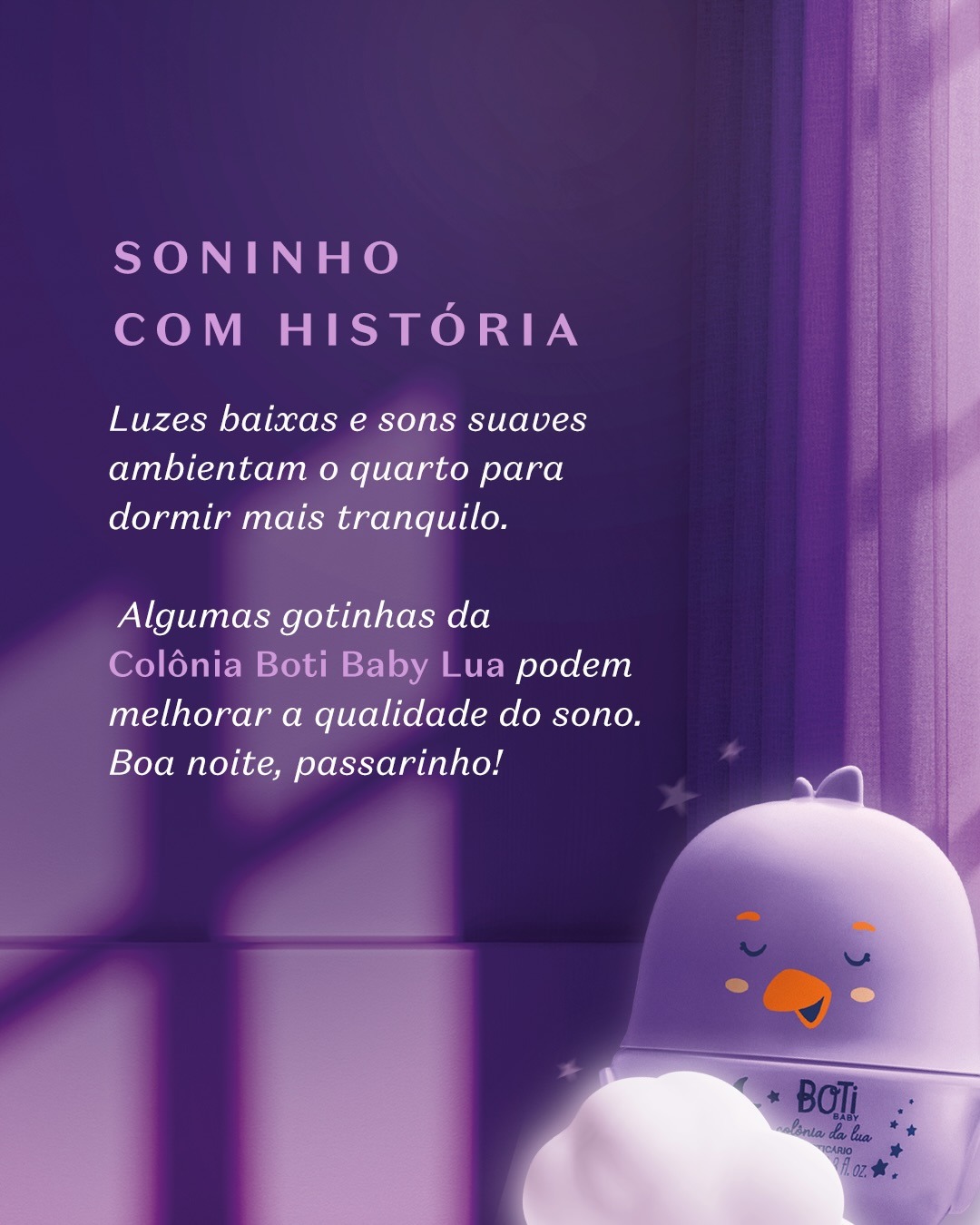 A Colônia Boti Baby Lua finaliza o ritual com uma fragrância suave, sinalizando que chegou a hora de dormir.