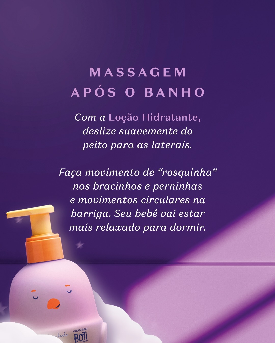 O ritual começa com a Espuma de Banho Boti Baby Lua, que limpa suavemente, não arde os olhos e cria uma espuma cremosa com fragrância relaxante.