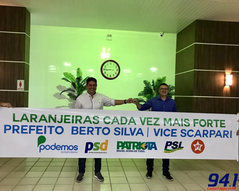O nome da coligação ficou: “Laranjeiras Cada Vez Mais Forte†com Podemos, PSD, PT, Patriota e PSL.