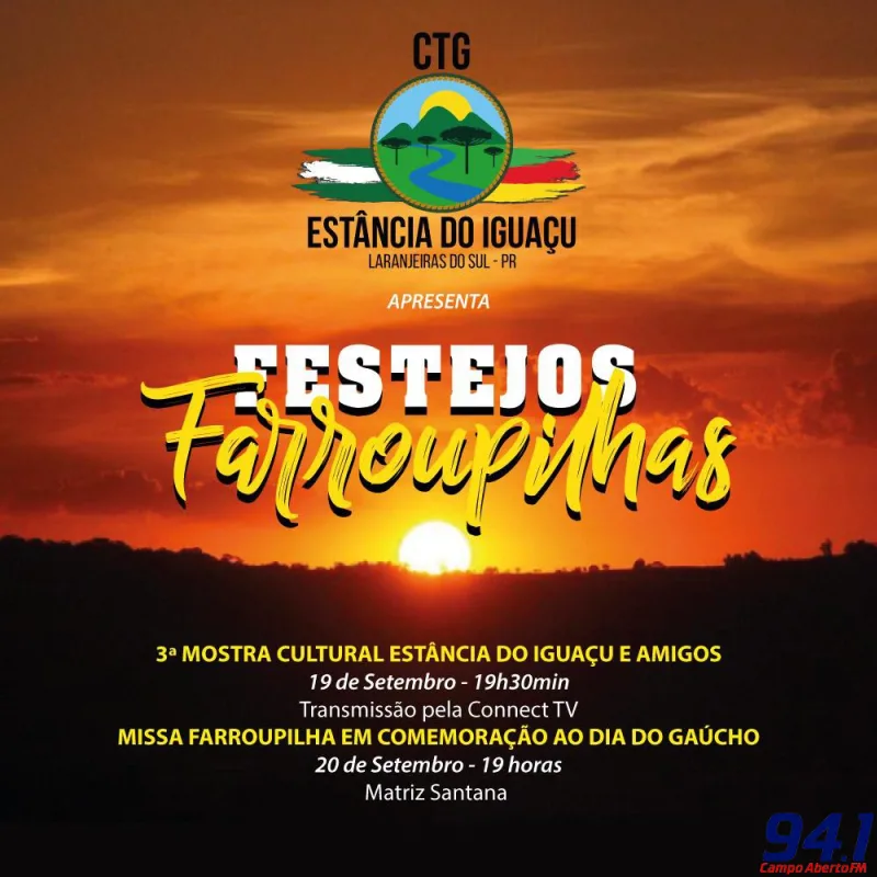 Em Laranjeiras do Sul, o CTG Estância do Iguaçu programou para este sábado, 19 de setembro, às 19:30h, a terceira edição da Mostra Cultural Estância do Iguaçu e Amigos, com o tema "Juntos mesmo à distância", só que será através de Live, pelo Youtube da Connect TV.
