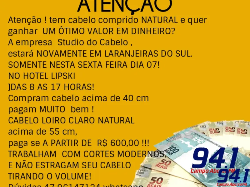 estará novamente em Laranjeiras do Sul comprando cabelo