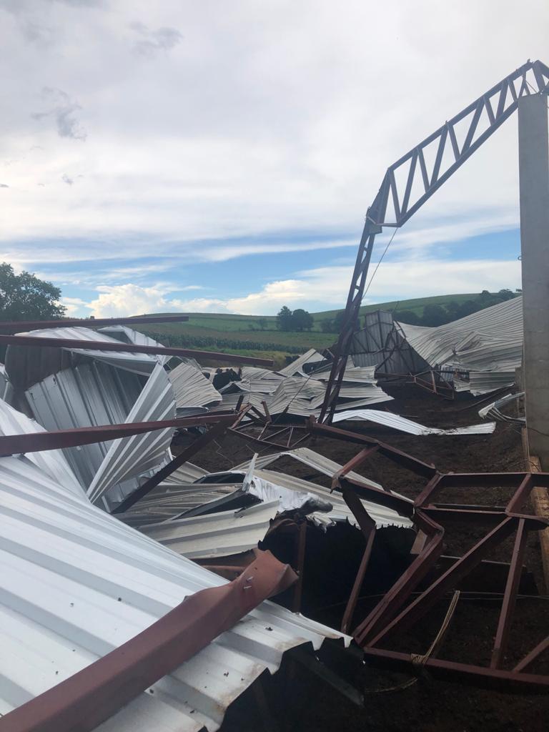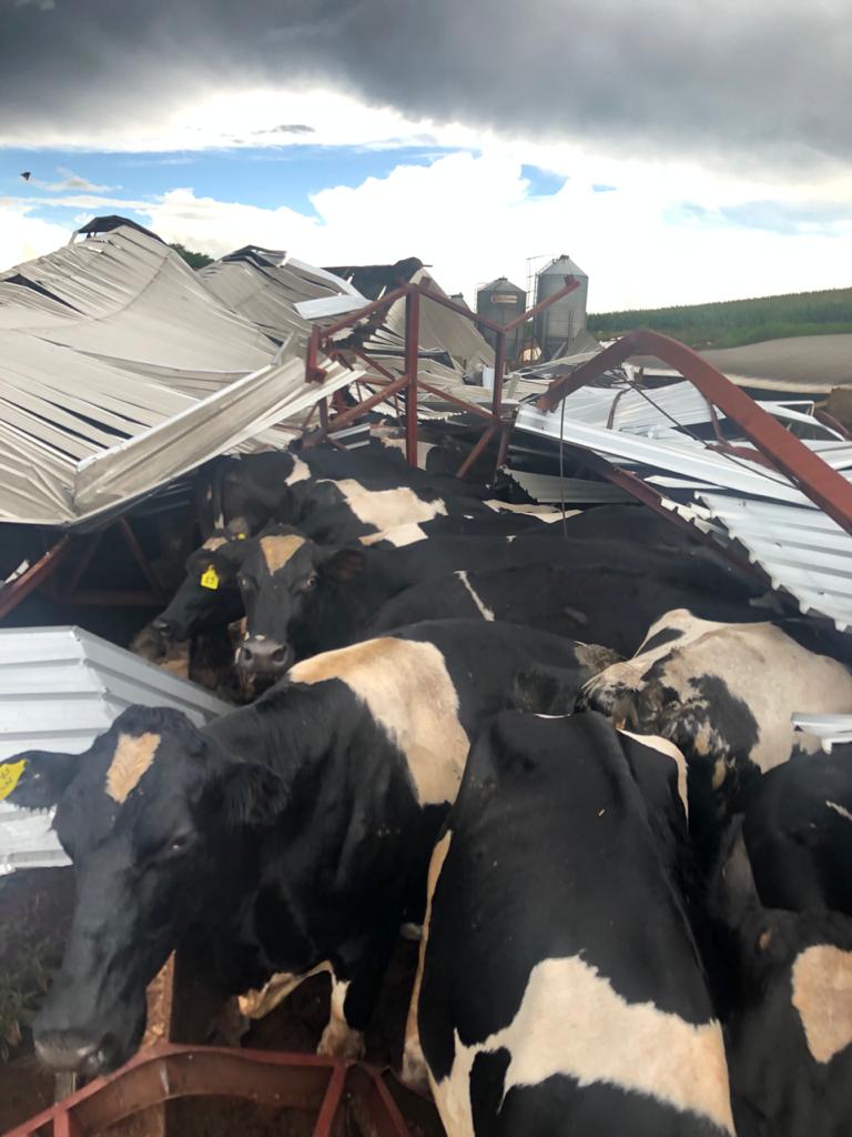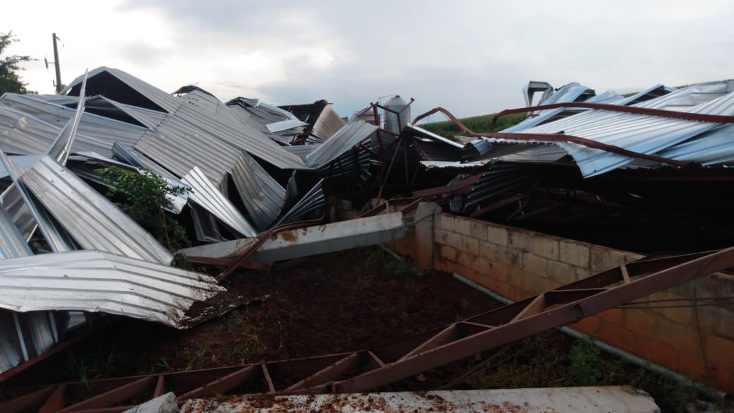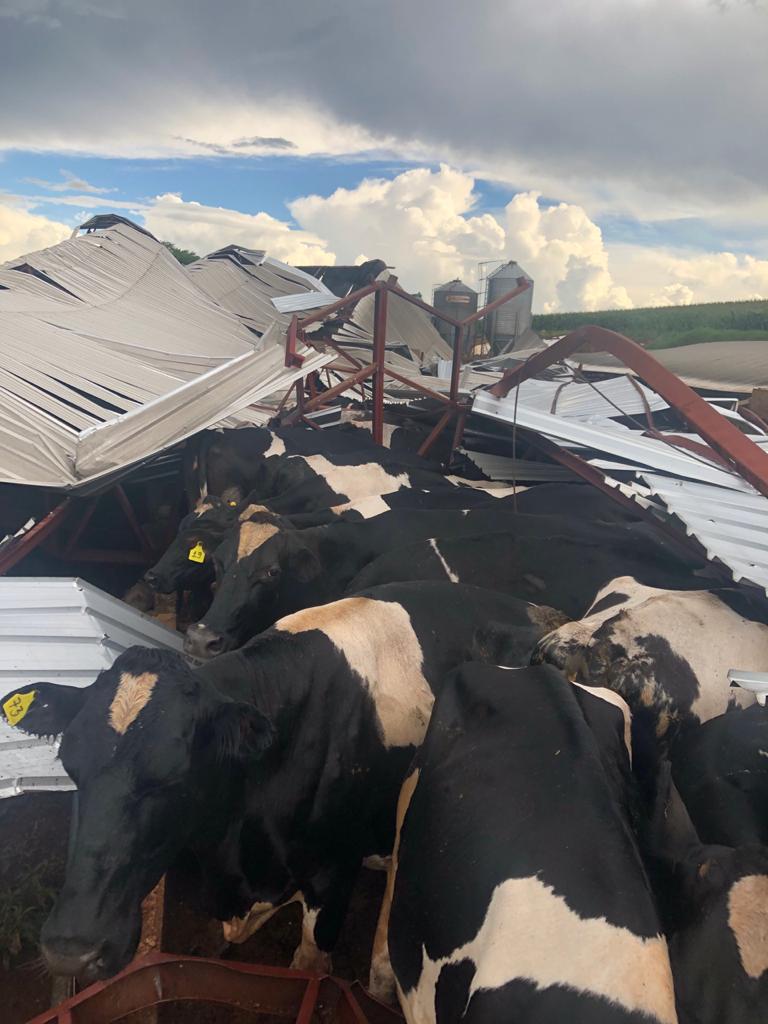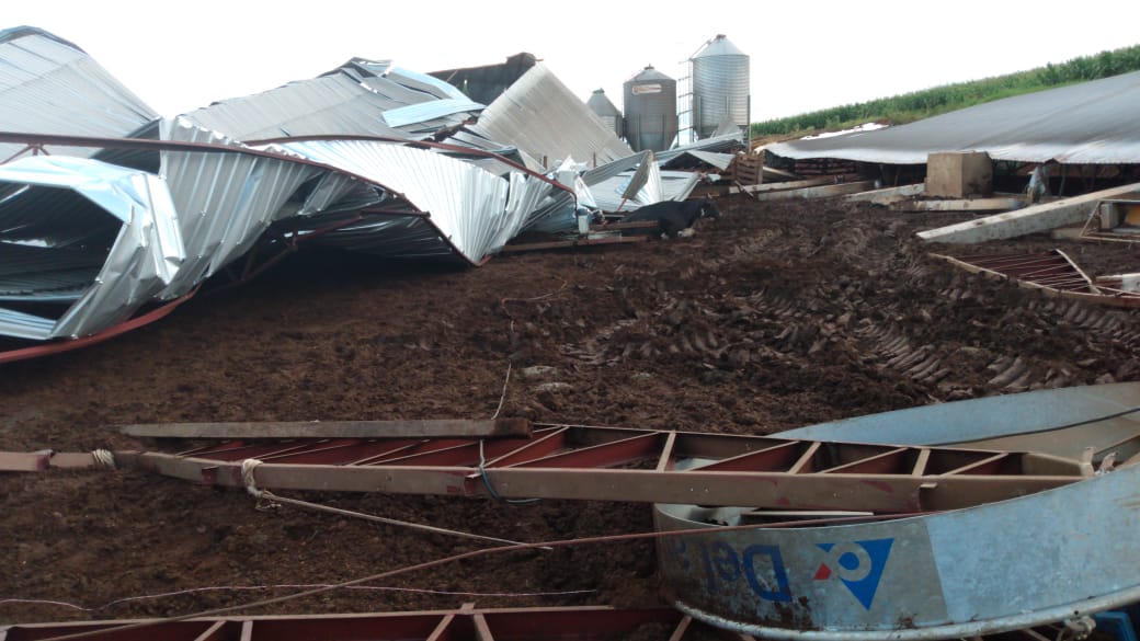 As fotos desta matéria são da propriedade de Paulo Possato, onde os prejuÃzos foram grandes. Um barracão usado pelas vacas leiteiras ficou totalmente destruÃdo, e alguns animais ficaram feridos.Â